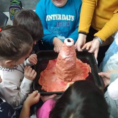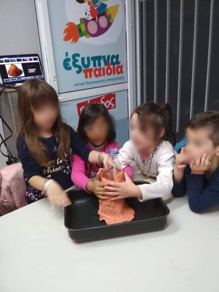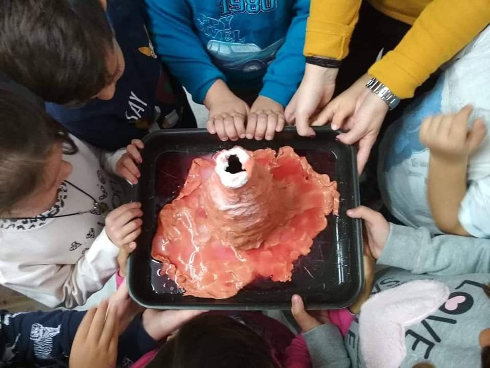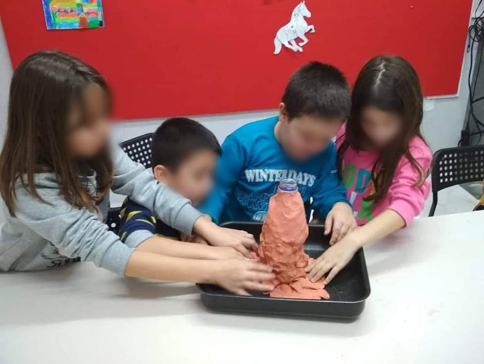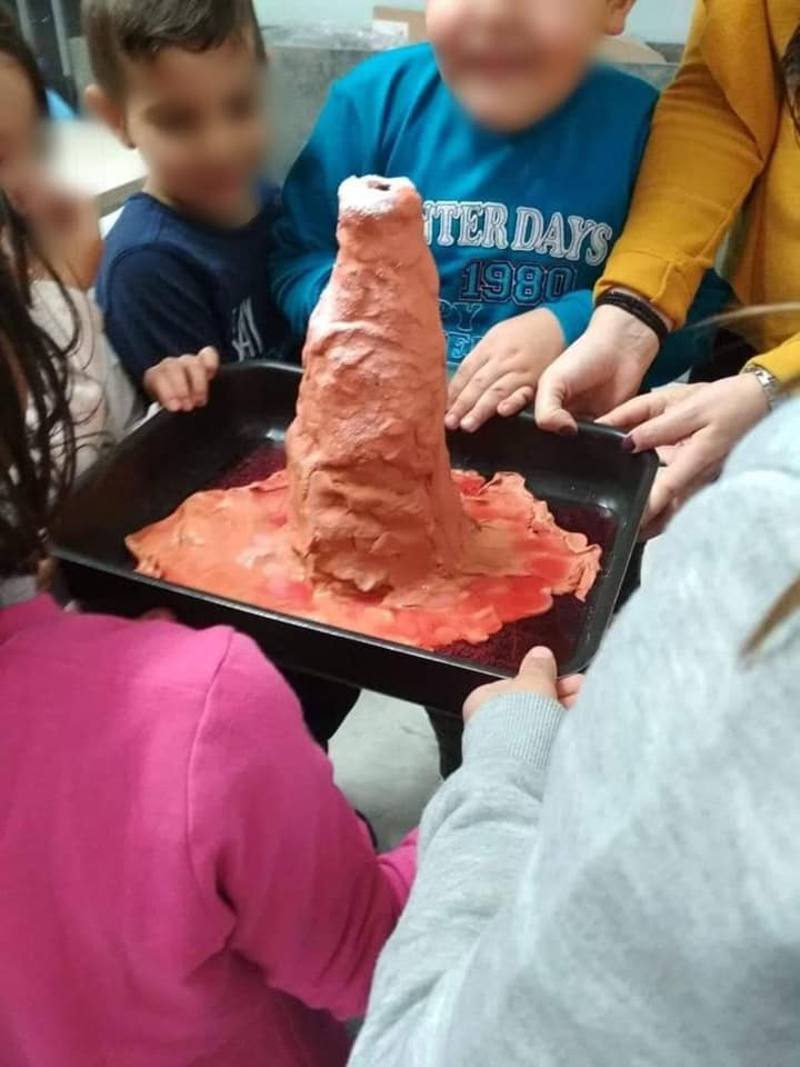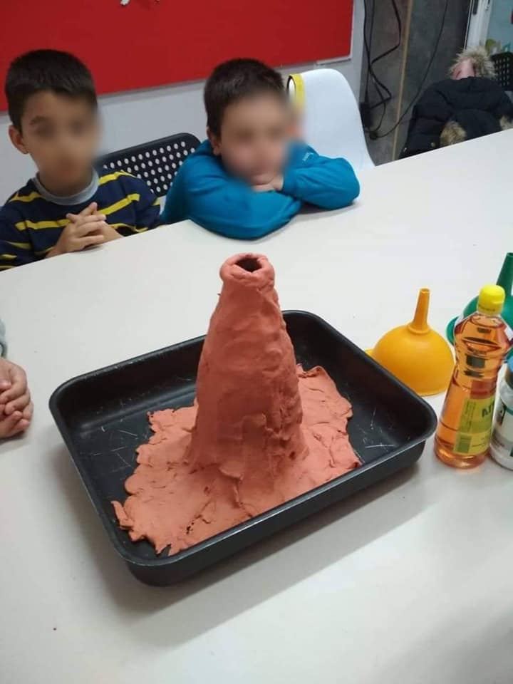Με καφέ πηλό κατασκευάζουν ένα ομοίωμα ηφαιστείου και στη συνέχεια δοκιμάζουν το πείραμα που αναπαριστά μία έκρηξη, χρησιμοποιώντας ένα μπουκάλι ξύδι, κόκκινο χρώμα ζαχαροπλαστικής και σόδα.