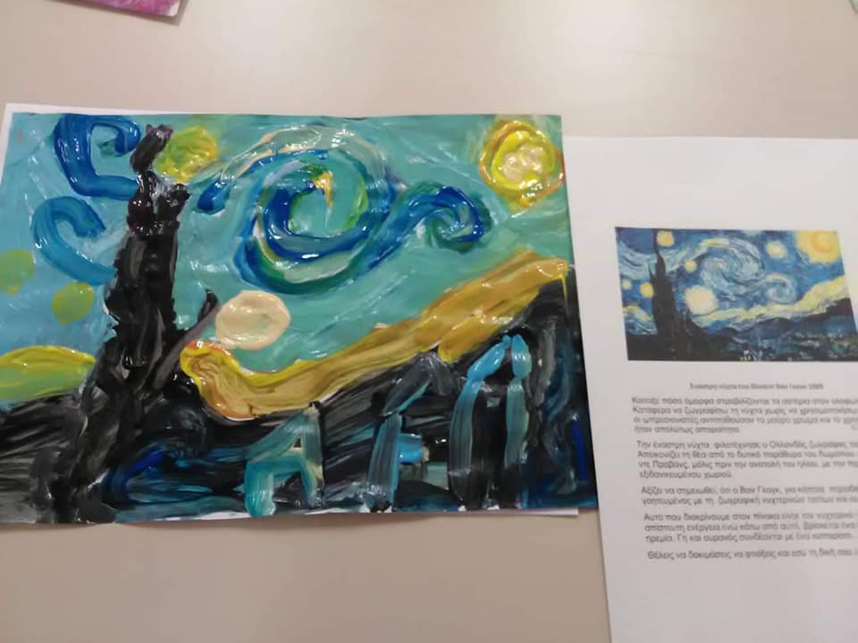 Οι μικροί μας καλλιτέχνες μελέτησαν τον υπέροχο πίνακα του Van Gogh “Starry Night”- “ Έναστρη νύχτα” και έμαθαν για την ιστορία που κρύβεται πίσω από αυτόν. Τον παρατήρησαν, μελέτησαν τα χρώματα, την κίνηση των αστεριών και παρακολούθησαν βίντεο που δείχνουν τον πίνακα σε κίνηση. 💎
