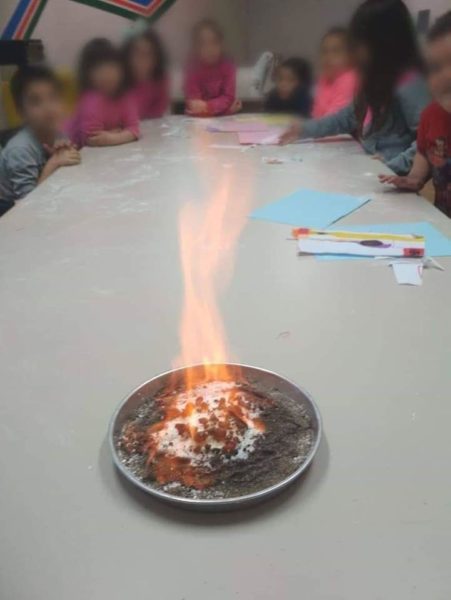 Έτσι, σε ένα πιάτο με άμμο, αφού ρίξαμε οινόπνευμα και από πάνω ένα μίγμα ζάχαρης και σόδας, με έναν αναπτήρα βάλαμε φωτιά. Παρατηρήσαμε ότι προέκυψαν κάποια μαύρα στίγματα που γρήγορα όμως διογκώθηκαν δημιουργώντας το φίδι ή άλλα περίεργα σχήματα. 🐍