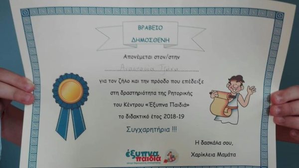 Για την εξαιρετική τους επίδοση, την οποία υπερθεμάτισε και η ίδια η συγγραφέας, καθώς και για τη συνολική πρόοδο και τον ζήλο που τους διέκρινε καθ’ όλη τη διάρκεια της χρονιάς, απονεμήθηκε στους μικρούς μας ρήτορες το “βραβείο Δημοσθένη”, με την ευχή να αποκτήσουν όχι μόνο την ευχέρεια λόγου του μεγάλου ρήτορα αλλά και τις αρετές της επιμονής, της πίστης και της αυτοπειθαρχίας στη ζωή τους.📜