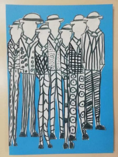 ⚫⚪Έπειτα παρακολουθήσαμε εκπαιδευτικά βίντεο με την ανάλυση της δουλειάς του καλλιτέχνη, συζητήσαμε και δημιουργήσαμε δικά μας «ασπρομαυρα πλήθη» και τα τοποθετήσαμε σε χρωματιστές επιφάνειες χαρτιού ως αναφορά στο έργο του καλλιτέχνη 🔴🔵