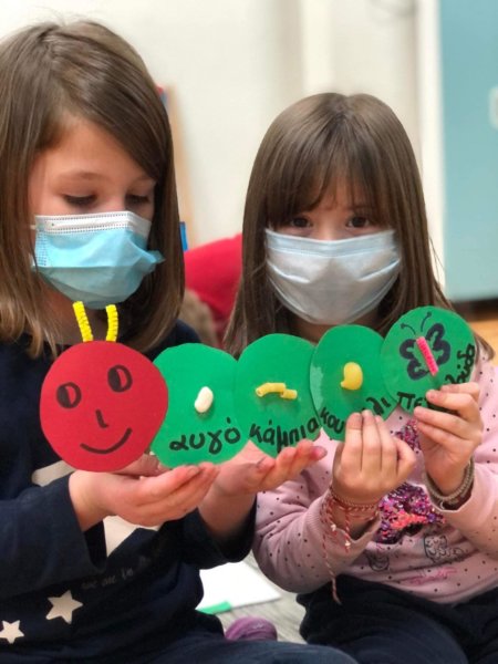του αυγού, μακαρόνι κοφτό ως αναπαράσταση της κάμπιας, ένα μακαρόνι κοχύλι ως αναπαράσταση της χρυσαλίδας(κουκούλι) και τέλος ζωγραφίζουμε και την πεταλούδα.