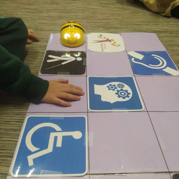 👩🦯👩🦯Η μέλισσα ρομπότ περνά από όλες τις εικόνες που συμβολίζουν τις διαφορές αναπηρίες.