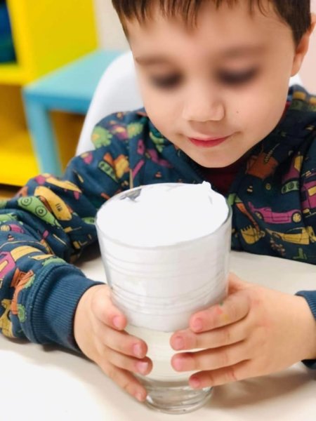 🧪Γεμίζουμε το 1/2 του ποτηριού με νερό και απο πάνω βάζουμε μια γενναία δόση αφρού ξυρίσματος (το σύννεφο) μέχρι το ποτήρι να είναι γεμάτο στα 3/4 του περίπου. Με ενα κουτάλι κάνουμε φλατ την επιφάνεια του σύννεφου. Αναμεγνύουμε μισό ποτήρι νερό και 10-12 σταγόνες μπλε χρώματος ζαχαροπλαστικής(βροχή-υδρατμοί). Με ένα κουτάλι ρίχνουμε κουταλίτσα κουταλίτσα το μείγμα μας στο σύννεφο.