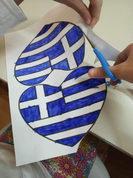 ♥️♥️Ύστερα, δημιούργησαμε τη σημαία της χώρας μας, γαλανόλευκη, στα χρώματά της, αλλά σε σχήμα καρδιάς, γιατί είναι χαραγμένη αυτή η χώρα βαθιά μέσα στην καρδιά μας! ❤️